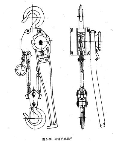 环链手扳葫芦的结构如图1-28所示,它采用一级齿轮转动,主要有齿轮轴、齿轮、制动器、起重链条、链轮、吊钩、操作手柄等。
